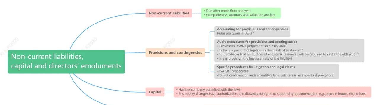 In this chapter, we begin with the audit of non-current liabilities and provisions. Questions on long-term liabilities such as long-term loans may be linked to other areas you have studied in the AA syllabus. For example, as part of a question on going concern you may be required to list procedures to audit the ability of the company to repay a long-term loan. Procedures detailed in this chapter will be relevant, for instance, confirming the terms of the loan to a loan agreement or evidence of whether any covenants exists.