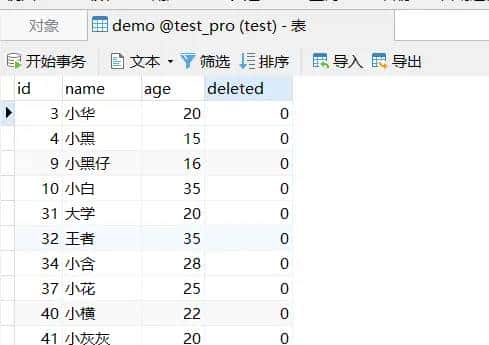 在原来的数据库表——test_pro.demo表中添加deleted字段,并设置默认值为0: