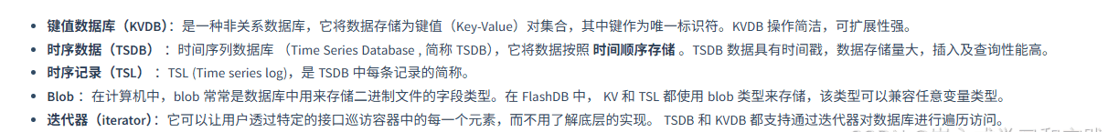 键值数据库 :是一种非关系数据库,它将数据存储为键值(Key-Value)对集合,其中键作为唯一标识符。KVDB 操作简洁,可扩展性强。时序数据库 :时间序列数据库 (Time Series Database , 简称 TSDB),它将数据按照 时间顺序存储 。TSDB 数据具有时间戳,数据存储量大,插入及查询性能高。