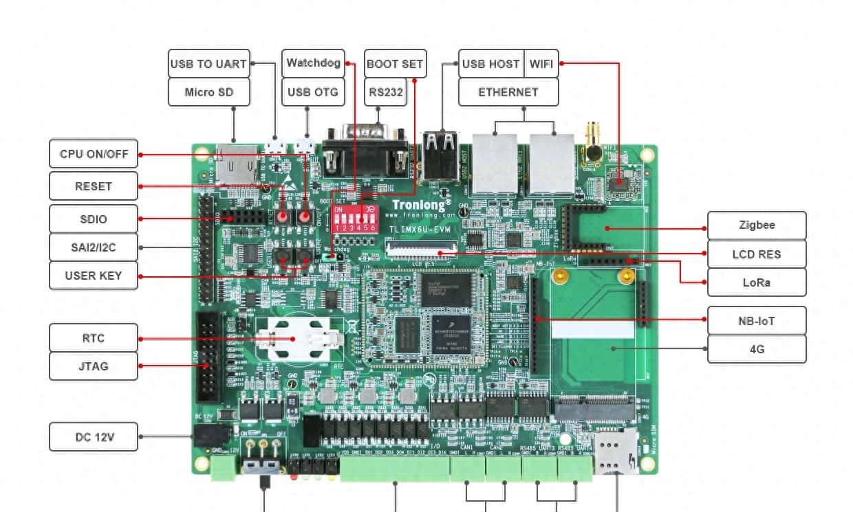 评估板接口资源丰富,引出双路网口、双路RS485、双路CAN、三路USB、多路DI/DO、LCD等接口,板载WIFI、Bluetooth模块,支持LoRa、NB-IoT、Zigbee、4G模块,可选配外壳直接应用于工业现场。
