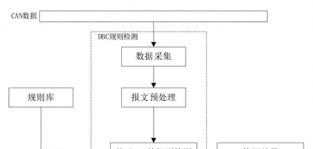基于DBC的报文检测,第一加载内置的规则库。检测时,采集CAN总线数据并进行CAN报文的预处理,然后根据规则库中的检测规则,对选定的报文字段进行检测。最终输出检测结果。