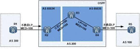 由于在外界看来,BGP联盟实际上是一个AS,所以其LP属性和MED属性在整个BGP联盟中是被保留的。