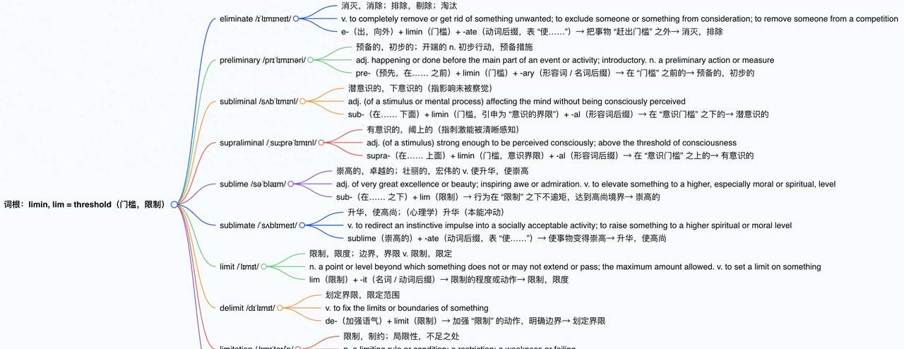“lim” 核心为 “限制”,既指 “物理或数量的界限”(如 limit “限度”),也可指 “道德 / 行为的约束”(如 sublime “崇高的”,因遵守约束而高尚),需结合语境理解延伸义。 - 词根变体与构词: