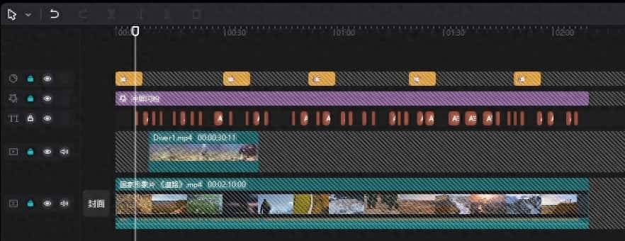 步骤二,使用“锁定轨道”的功能,把其它轨道上的素材全部锁定,仅文本字幕行不锁定,如下图所示;