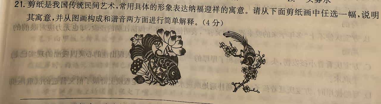21.剪纸是我国传统民间艺术,常用具体的形象表达纳福迎祥的寓意。请从下面剪纸画中任选一幅,说明其寓意,并从图画构成和谐音两方面进行简单解释(4分)