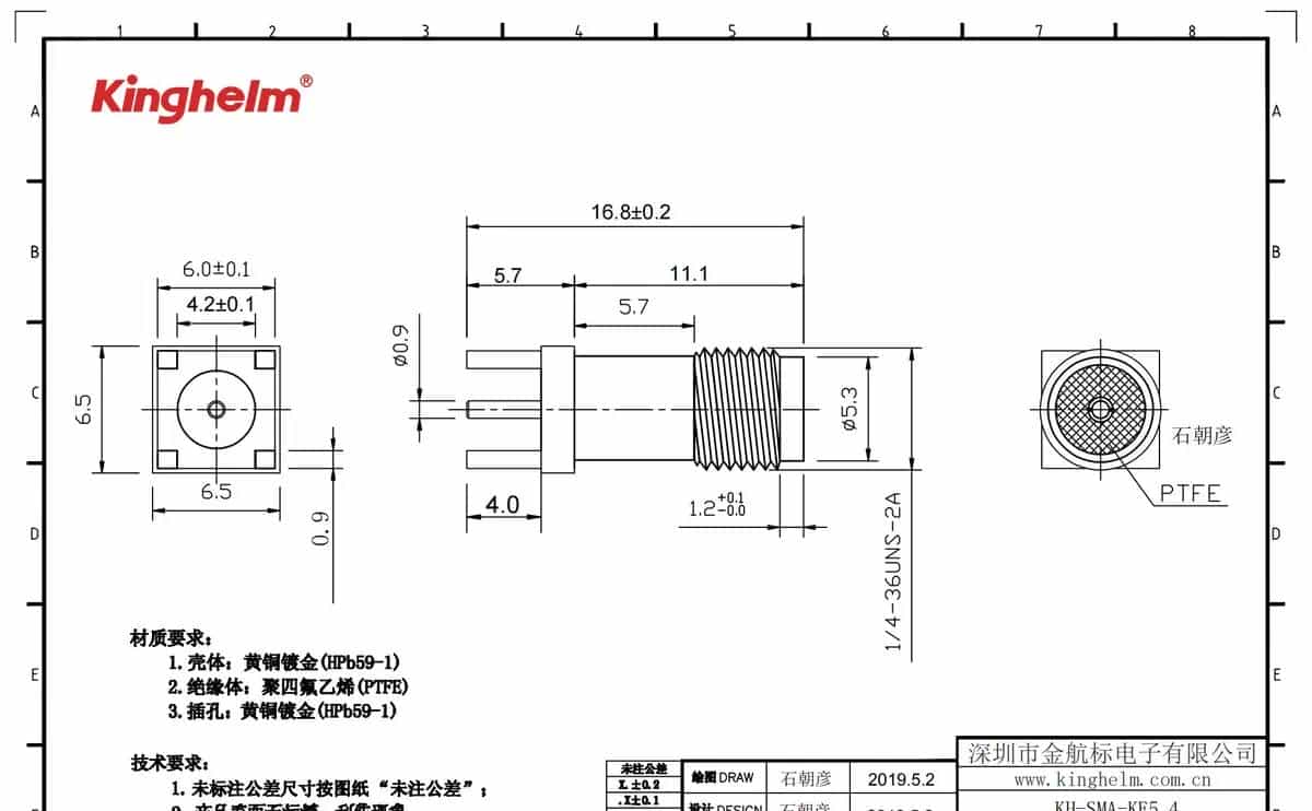 RF射频同轴连接器 > SMA板端 >KH-SMA-KE5.4 品 牌: kinghelm(金航标) 厂家型号: KH-SMA-KE5.4 封装: – 商品毛重: 2.64克(g) 包装方式: 托盘