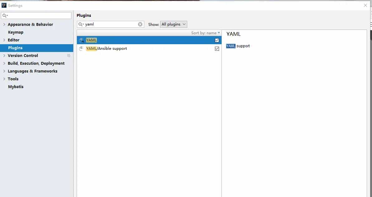 查看自己是否安装插件:Settings->plugins->输入框中输入YAML