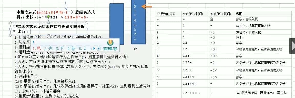 - 4.3 如果当前符号优先级比栈顶符号低或者相等,则将符号栈顶元素弹出并压入到中间结果栈中,最后将当前运算符压入到符号栈